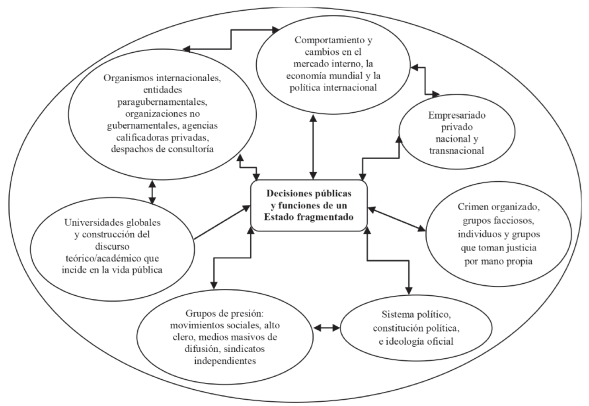 Más aún, el Estado, en tanto macroestructura institucional, se imbrica en redes globales de toma de decisiones que, si bien no lo subsumen del todo, trastocan y transforman sus fundamentos al intergenerarse con otros actores y agentes socioeconómicos y políticos, y al erigirlo como una entidad polifacética, difuminada, fragmentada en su poder y avocada a compartir su soberanía con otros poderes que no precisamente emanan de sus confines (ver: Figura 1).